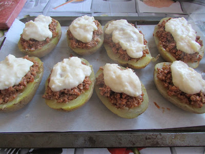 Gotowym sosem polałam masę mięsną umieszczoną w ziemniakach, a całość dodatkowo posypałam startym serem.